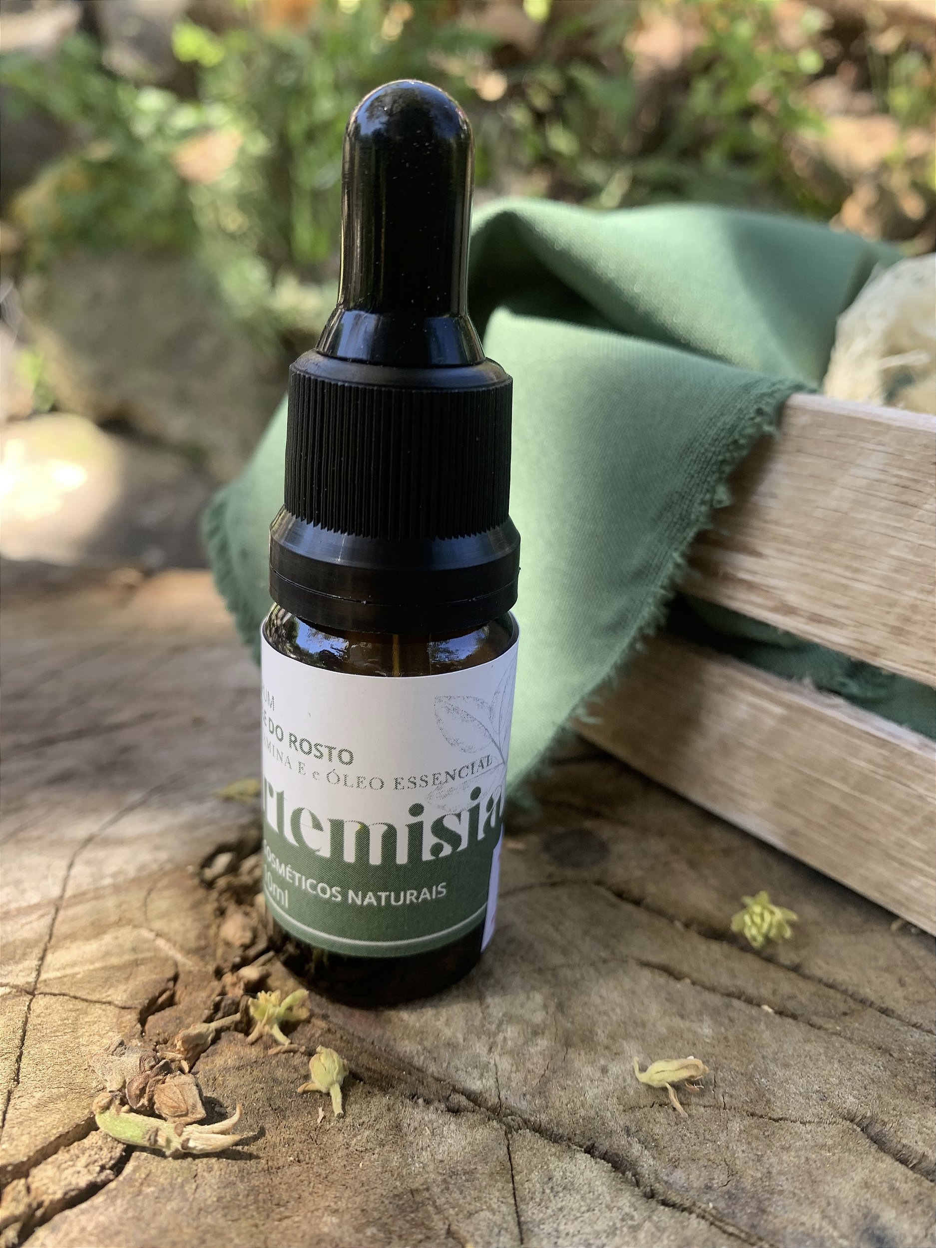 Sérum carregado de cuidados para a pele do seu rosto, com vitamina E e óleos essenciais.